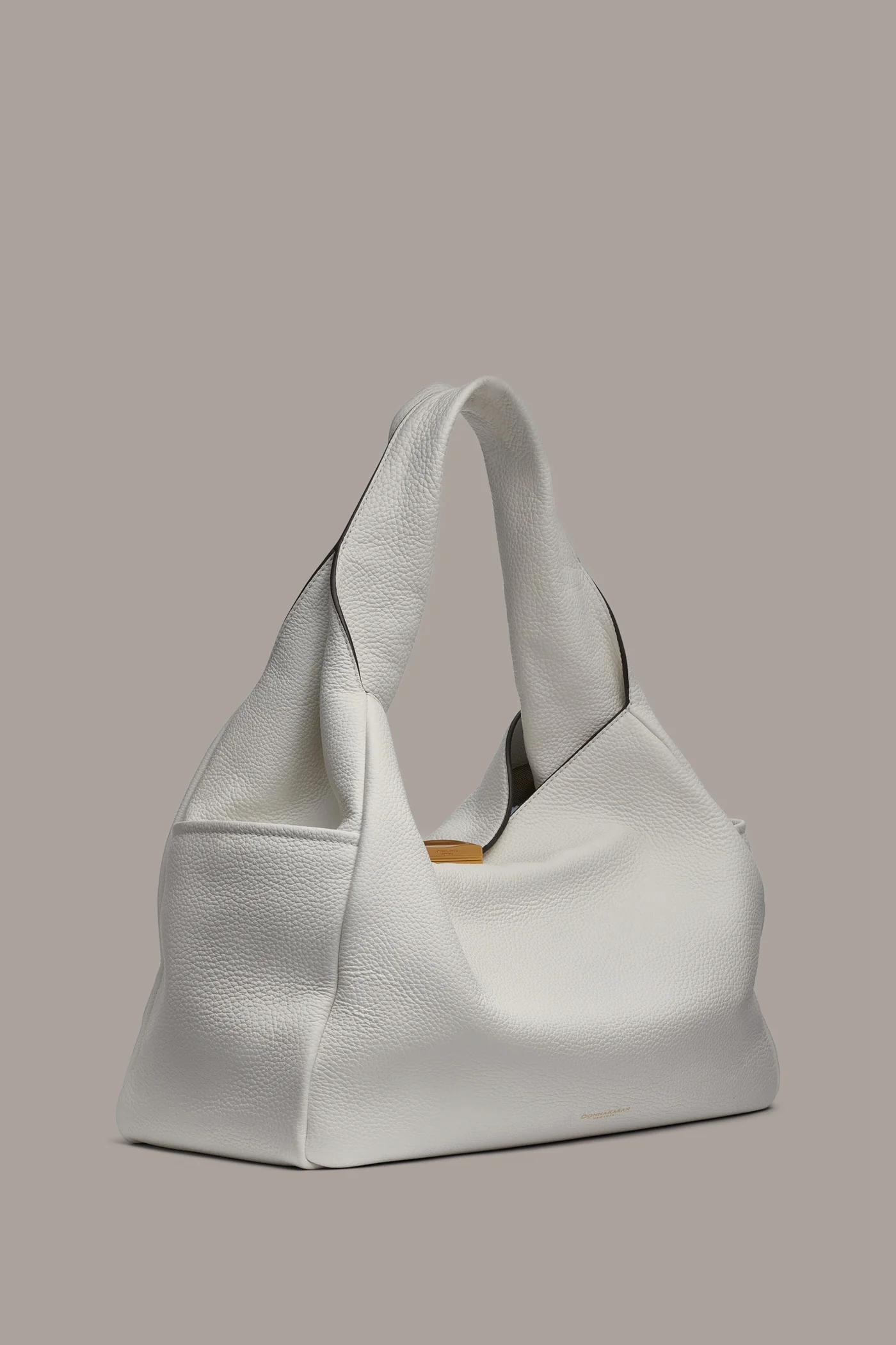 - Sculpted hardware- curved magnet top closure, curved zipper pulls