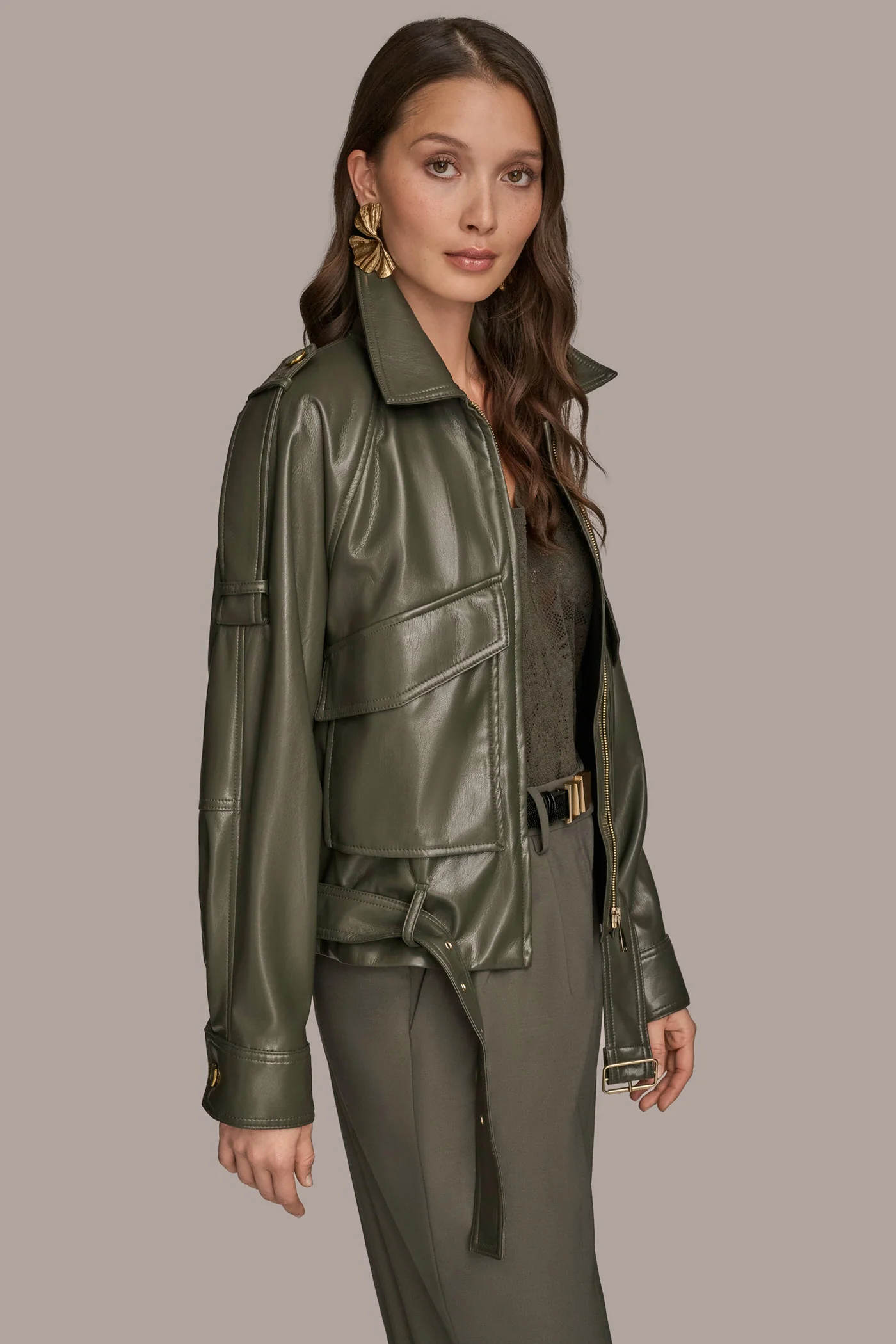 BELTED FAUX LEATHER BIKER JACKET