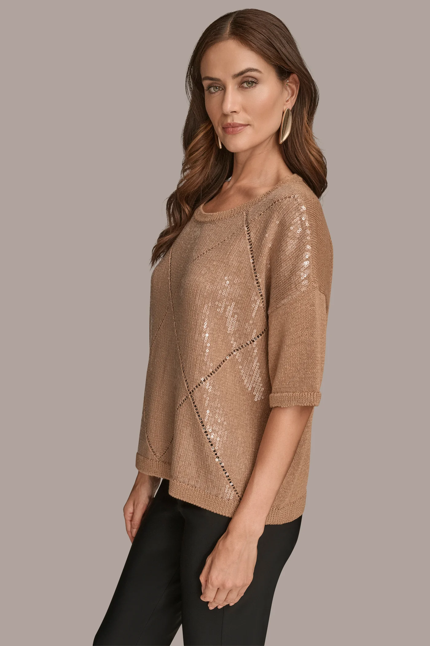 - Elbow-Sleeve Crew-Neck Sequin-Paneled Diamond-Stitch Sweater