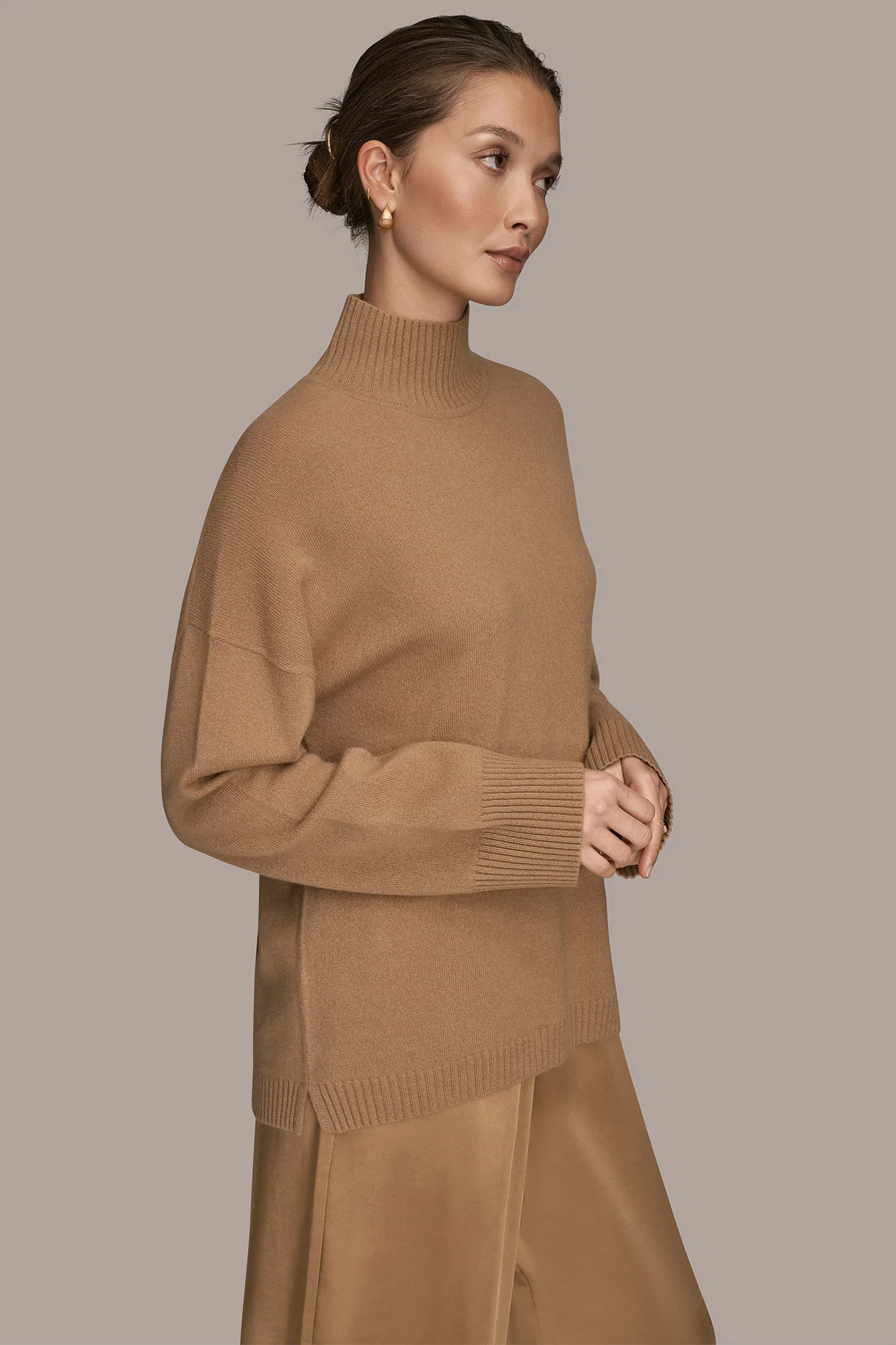 - Long Drop-Shoulder Sleeve Mock-Neck Sweater with Side Slits