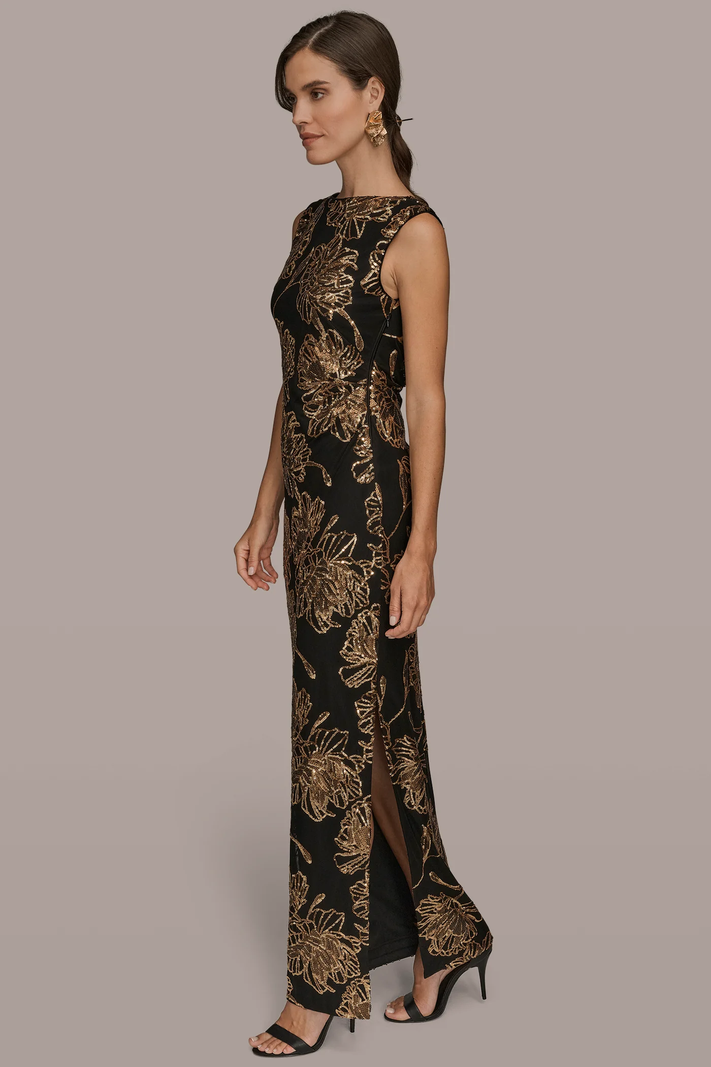 - Sleeveless Jewel-Neck Scoop-Back Floral Sequin-Embellished Gown with Split Hem