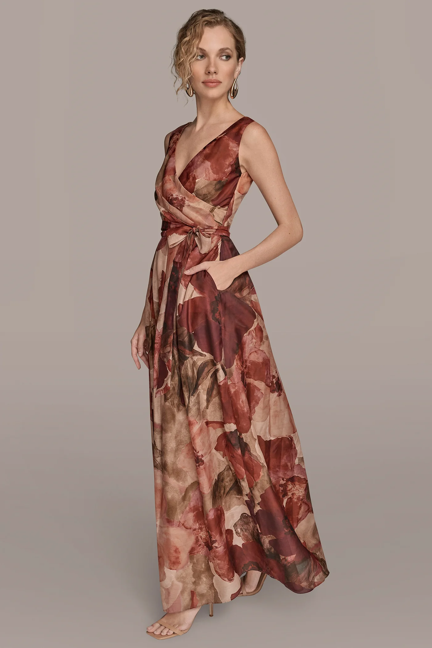 - Sleeveless Wrap-Effect V-Neck Floral Gown