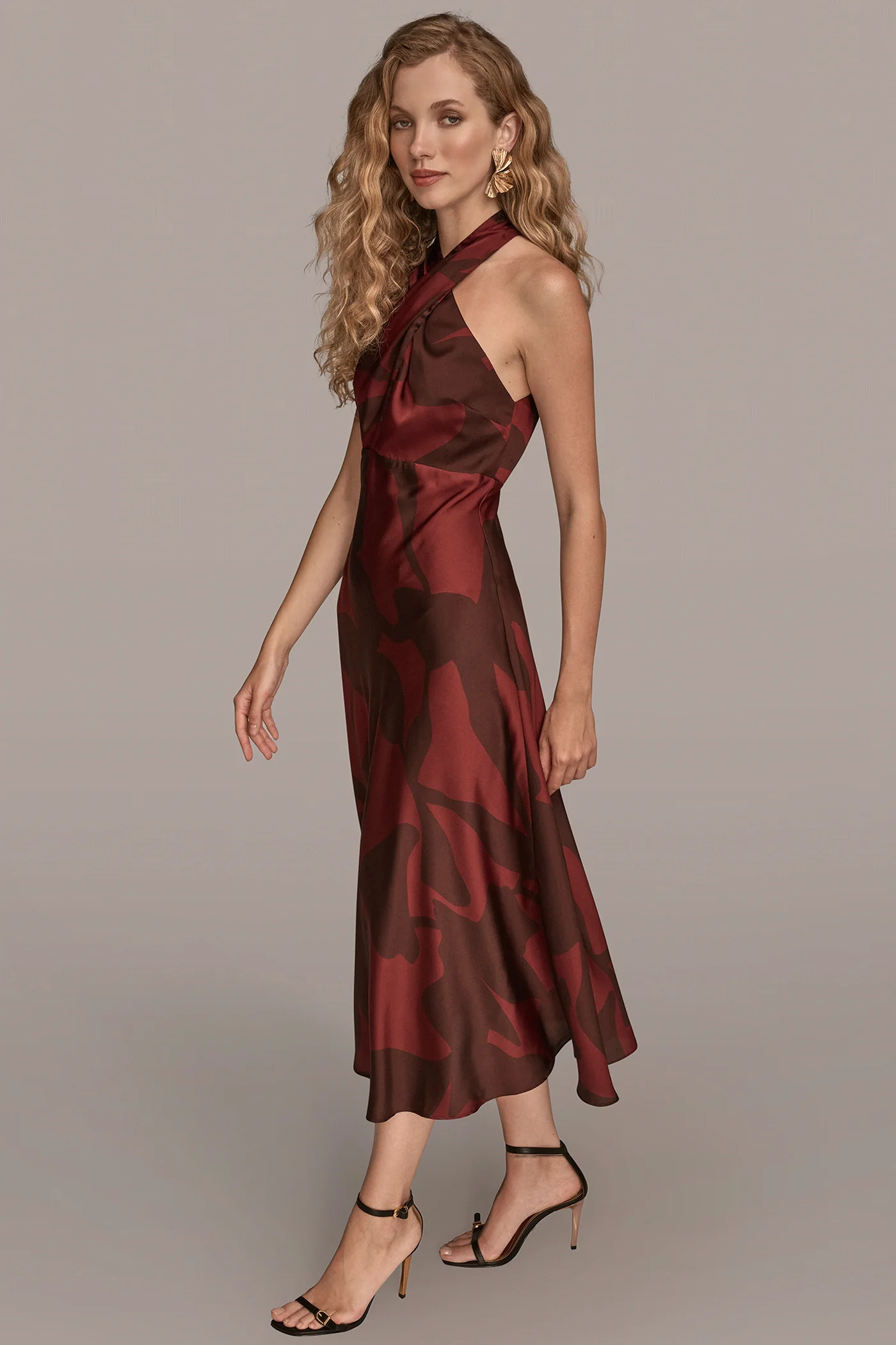 FLORAL CROSS-FRONT MIDI HALTER DRESS
