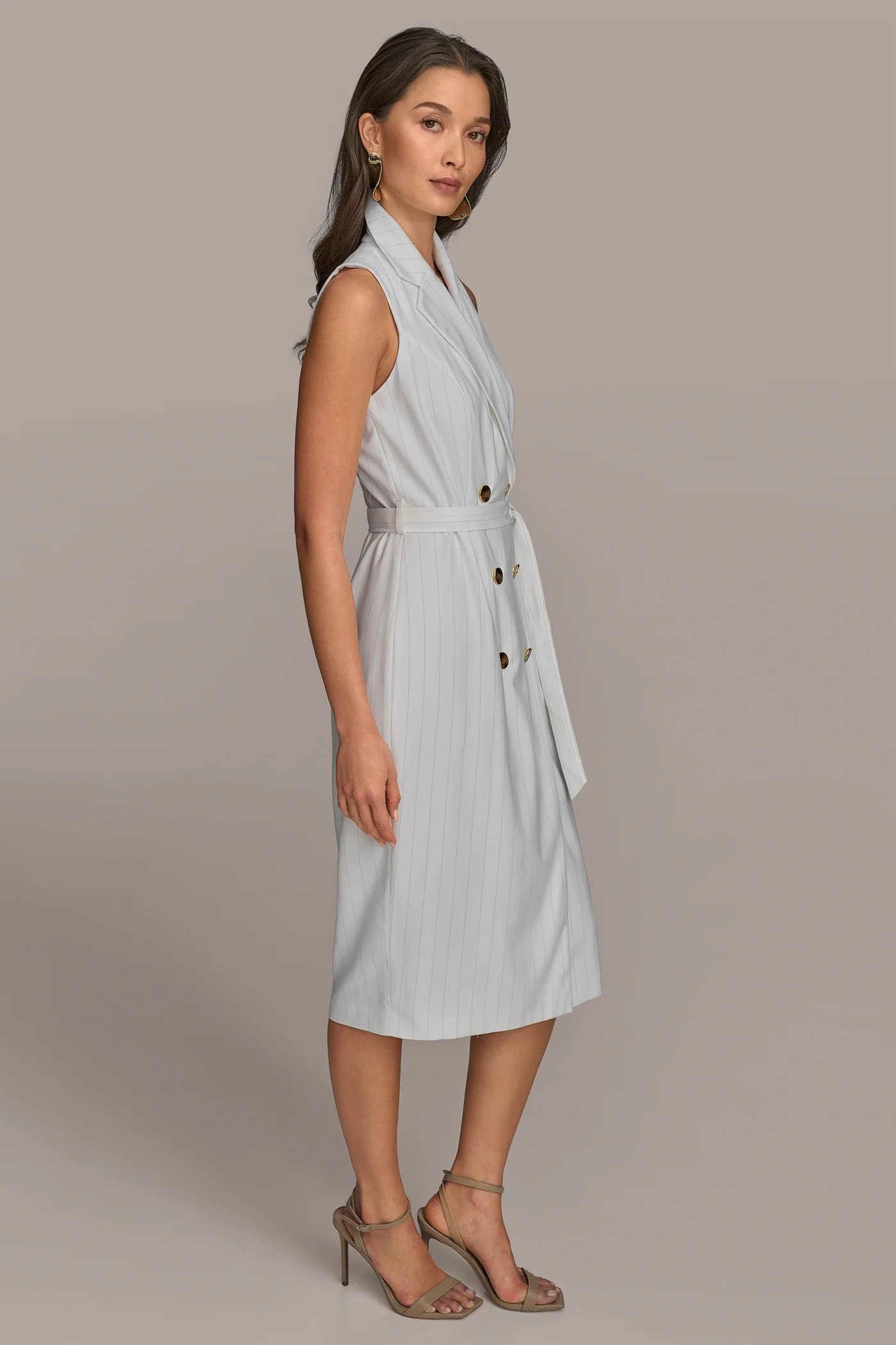 PINSTRIPED DOUBLE-BREASTED MIDI COAT DRESS