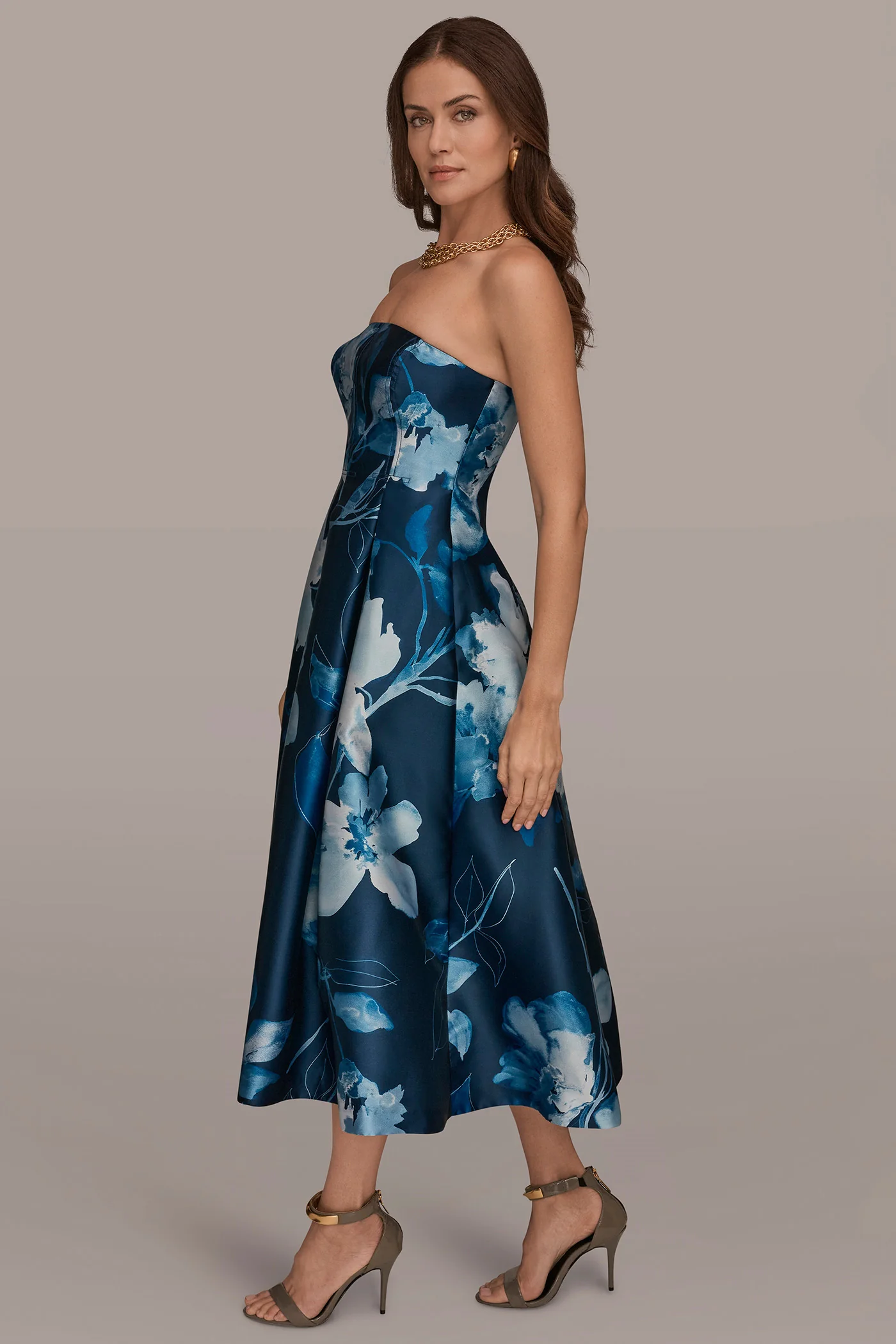 - Strapless Floral Print Seamed Pleated Midi A-Line Gown