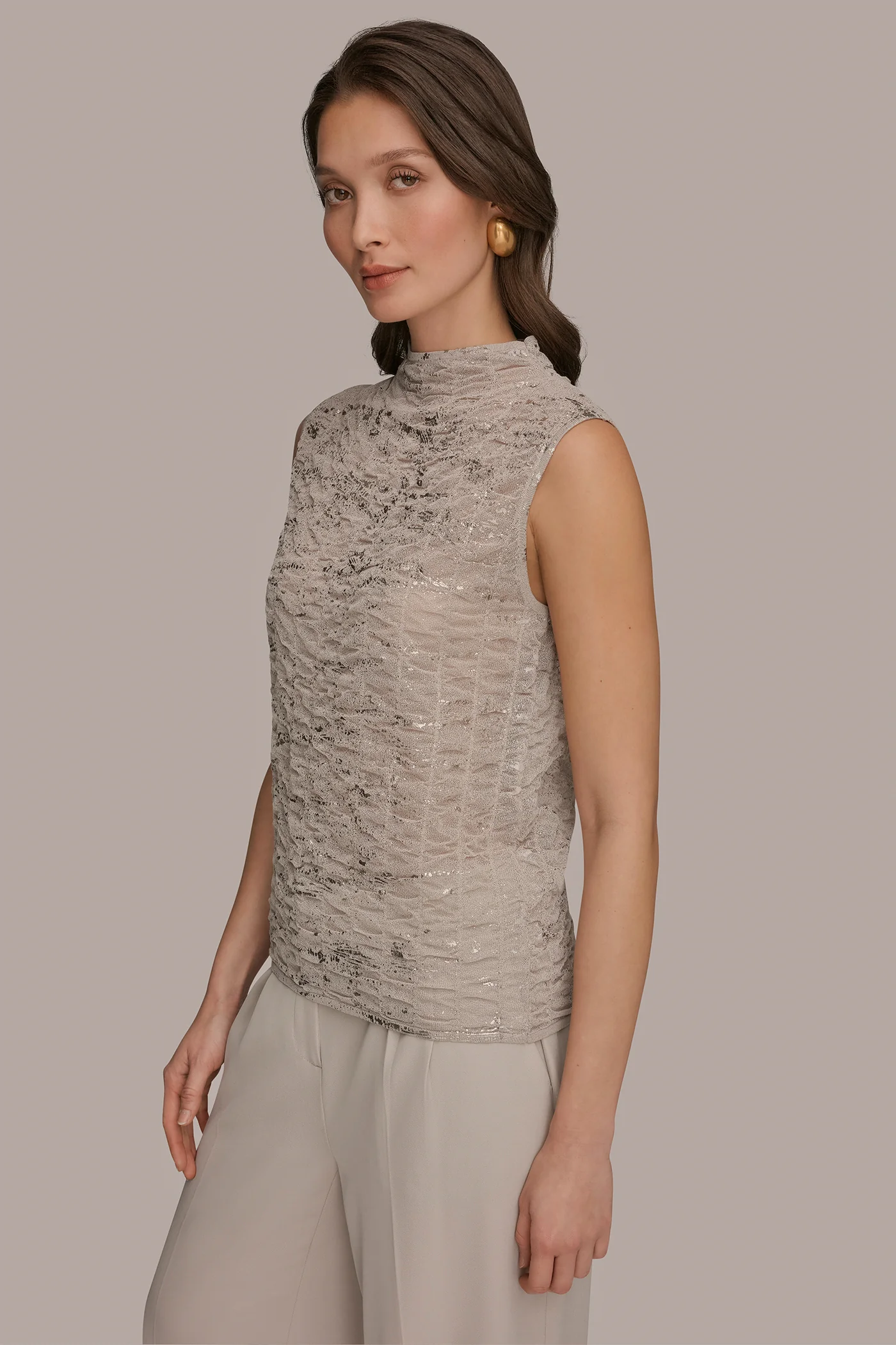 - Sleeveless Mock-Neck Metallic Foil Ruched Suit Sweater