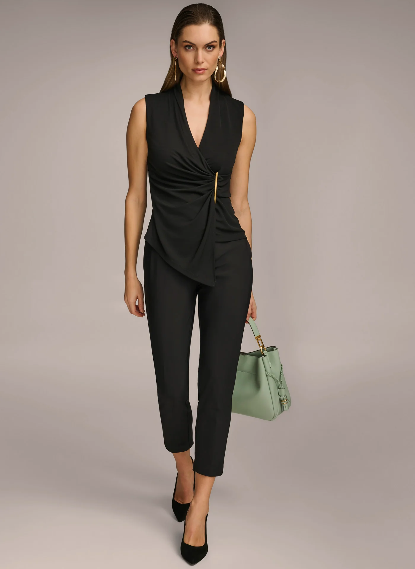 V NECK TOP WITH HARDWARE AND RUCHED DETAIL